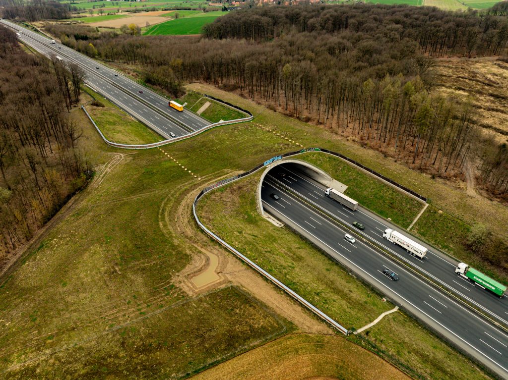 Wildlife crossings, dedicated fencing and adapted bridges allow animals to move safely across the corridor while reducing collision risks. Water protection systems manage runoff and protect nearby rivers and wetlands through retention and drainage infrastructure.